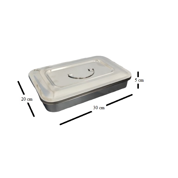 Bandeja de acero inoxidable con tapa, ideal para guardar, transportar y esterilizar instrumental médico. Resistente, higiénica y fácil de limpiar, recomendada para consultorios médicos, estaciones de enfermería, laboratorios y áreas clínicas.