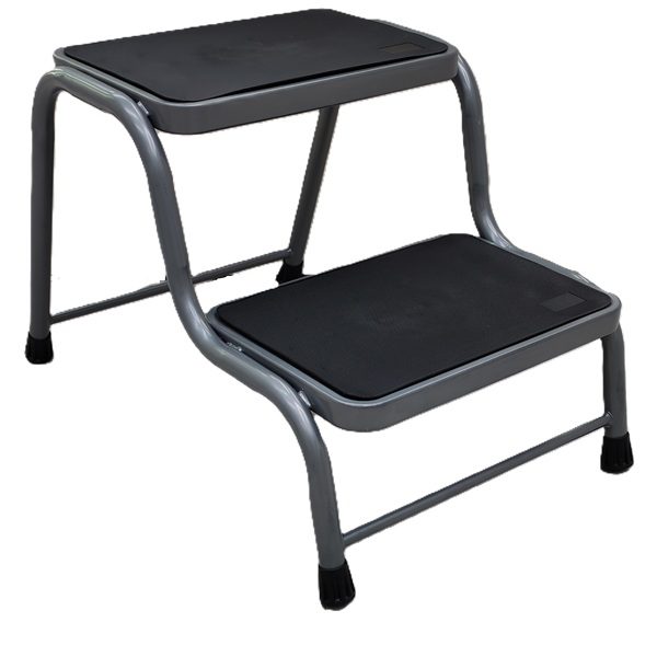 Gradilla escabel de 2 peldaños fabricada en acero reforzado con pintura electrostática de color gris. Diseñada para máxima seguridad con superficie antideslizante y regatones de PVC. Ideal para facilitar el acceso a camillas en entornos clínicos y hospitalarios. 40cm de altura total.